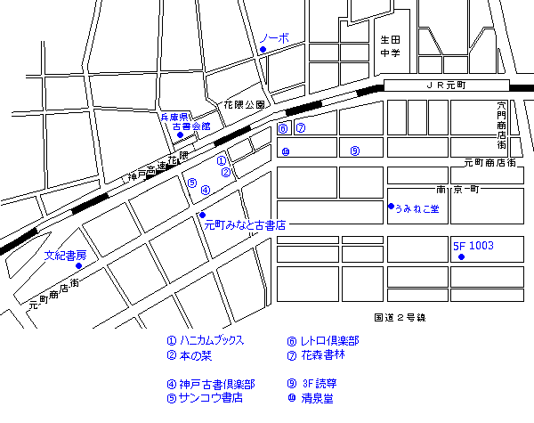 ●神戸元町みなと古書店 参加書店:ブックスカルボ、花森書林、口笛文庫、清泉堂書店、カラト書房、おくだ書店、サンコウ書店、 営業時間:10:00〜17:30 定休日:水 駐車場: 住所:神戸市中央区元町通4-2-14 |