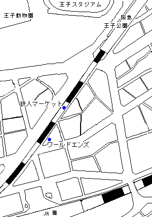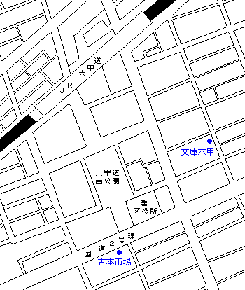 JR六甲道駅周辺には南の国道2号線沿いの六甲ボウル1Fに古本市場 灘店、南東に文庫六甲があります。