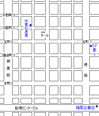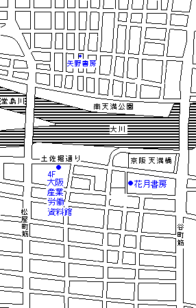 京阪電鉄・天満橋(てんまばし)駅周辺には、駅南に花月書房、駅北の大川を越えた北区の松屋町筋近くに矢野書房天満橋店があります。