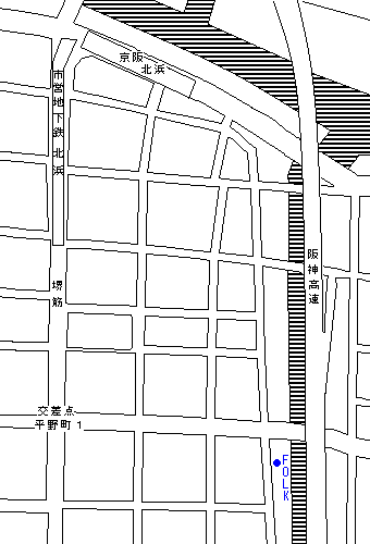 京阪・北浜(きたはま)駅周辺には、堺筋・平野1交差点の東、東横掘川近くにold book store FOLKがあります。