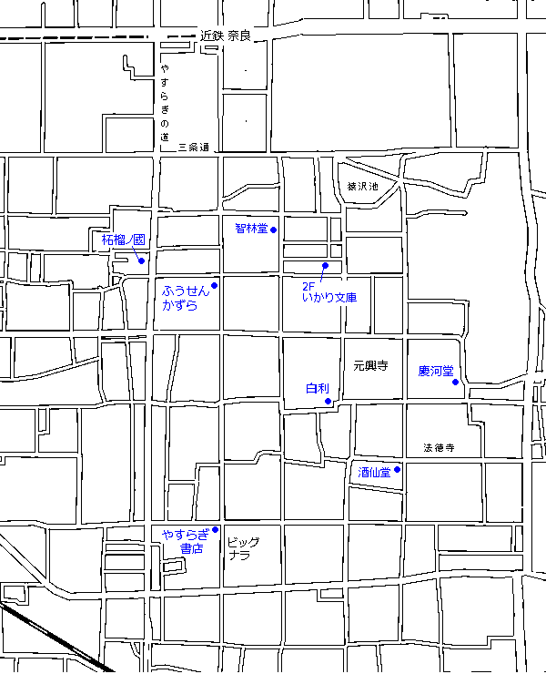 ●智林堂(チリンドウ)書店 洋書、ミステリー、小説、郷土史、専門書、絵葉書、思想、哲学、一般、文庫、古典文学、芸能、音楽 営業時間:11:00〜18:30 定休日:不定休 駐車場: 住所:奈良県奈良市餅飯殿町39 |