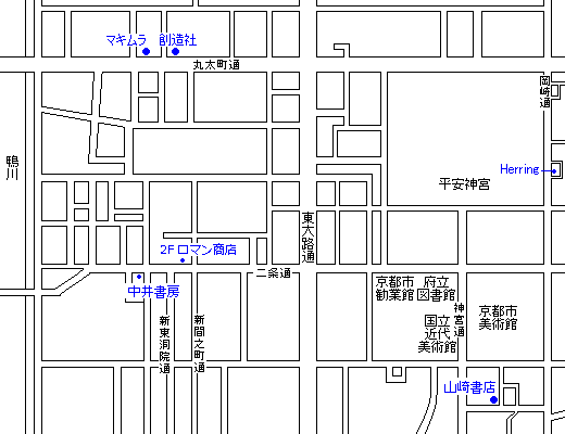 ●中井書房 文学、歴史、郷土史、宗教、思想、趣味、娯楽、一般 営業時間:11:00〜19:00 定休日:不定休 駐車場: 住所:京都市左京区二条通川端東入新車屋町163 |