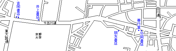 ●吉岡書店 本店 思想、哲学、法学、語学、歴史 営業時間:10:00〜18:00 日・祝 13:00〜18:00 定休日: 駐車場: 住所:京都市左京区田中門前町87 |