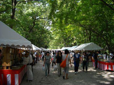 阪神・西宮駅からすぐだし、境内は広々して、うっそうと木々が生い茂って、緑陰でじっくり楽しめるはず。よく、陶器市やら菊花展を開催しているから、ぜひ古本まつりも!