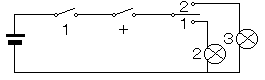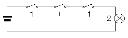 用意するものは乾電池一個、豆電球1個、銅線、スイッチ3個。それを図のように配線します。