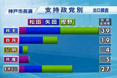 ●2009年10月18日 10月25日投票の神戸市長選挙もいよいよ中盤。 独断と偏見の中間現状予測です。 中間予測では、無所属新人 樫野孝人氏(46)が大きくリード、共産党公認新人 松田隆彦氏(50)があとを追う展開と予測します。 現職候補は大苦戦中ではないかと。 ミンス支持層には、神戸市がこれまで行ってきた、山のような外郭団体をつくって天下りをするインチキ行政を支持することと、霞ヶ関官僚の天下り禁止をうたうミンスの2枚舌政治など受け入れられないようです。 国からの補助金を受け、市の金でなければ無駄な公共事業もOKなどという詭弁も受け入れられていないようです。(国の金も市の金も税金には変わりない) あとは自民・公明票の動向です。 ミンス単独推薦候補が自民・公明票で当選するというブザマな結果になるのでしょうか?(笑) 神戸市長選挙当選者予想のアンケートを行います。 予想投票はこちら。神戸市長選挙当選者予想アンケート |
