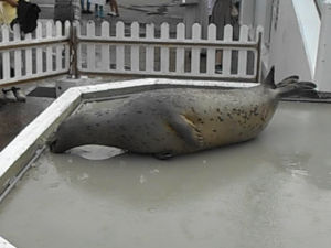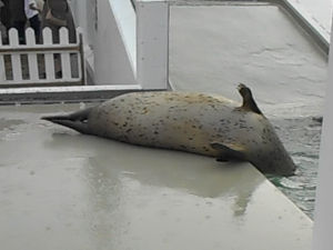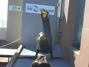 こちらはイルカ館の裏手の水槽でのエサやり時の訓練風景です。
