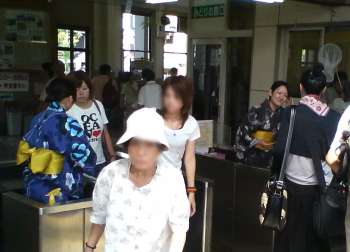 和田山から城崎に到着。改札の駅員さんが浴衣で出迎えてくれます。