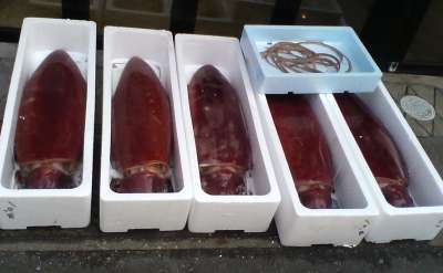 日本海で取れたとれた巨大イカや、湯の町交番の暖簾をかけてある交番など温泉街の風情を楽しみました。