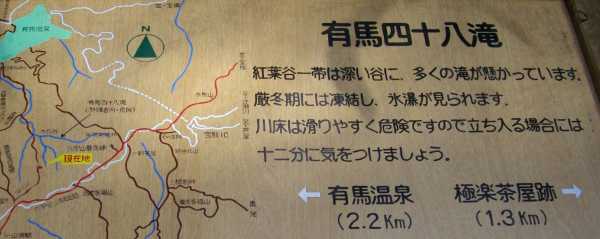 山道は有馬温泉の源泉に流れる水源が多く、有馬四十八滝へ通じる道に分岐しています