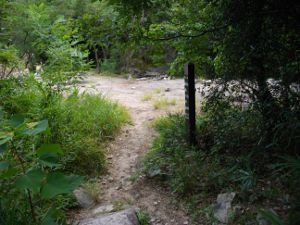 登山道に水が流れた跡がでてくると、ほどなく杣谷川が見え、杣谷峠と合流します。