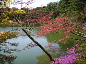 4月中旬の修法ヶ池です。池の亀たちがのんびり甲羅干しをしています。